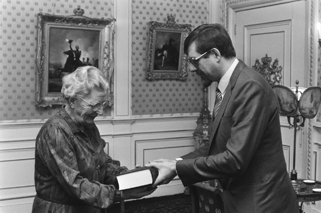 Prinses Juliana ontvangt het eerste exemplaar van het Groot Woordenboek van Hedendaags Nederlands op Paleis Soestdijk, 1984 | foto Croes, Rob C., Nationaal Archief / Anefo